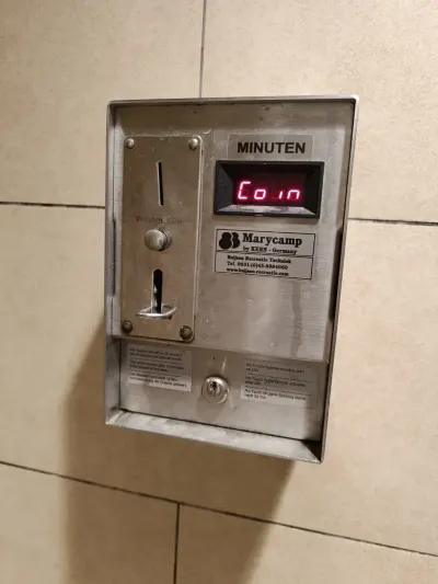 душ працює, вода тепла. 2.10 євро жетон + 1 євро в турнікет щоб добратись до душу. На душ дається 8 хв(час рахується лише тоді коли тече вода)