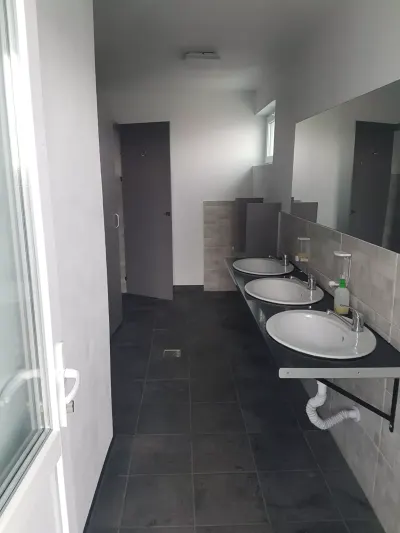 parcare nouă fără noroi, betonată,luminată, pază, duș femei , duș barbati, wc la fel separate, curate, totul ok.