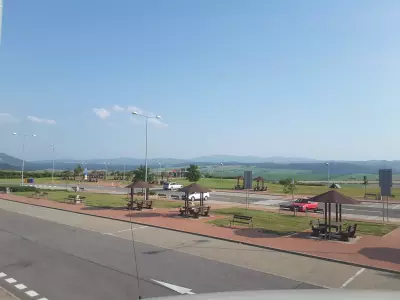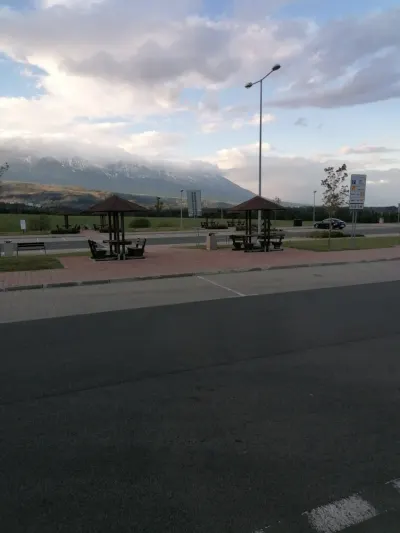 великий паркінг на 30-35фур )в ночі є освітлення ,є бідони для сміття , гарний краєвид на гори , є душ , туалет . на заправці є магазин , помірні ціни . є альтанки де можна присісти , дитячий майданчик . чистий паркінг .