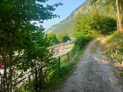 Маленький паркинг с туалетом. Станут 2 грузовика если легковыми не занято. Там где заезд на паркинг, можно выйти на дорожку и в город. Меньше километра до пляжа, с туалетом, тут: 46.662316,7.809692.
