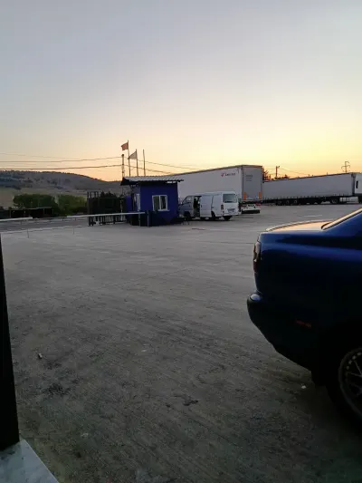 Бетонированная парковка. Чистая. Душ, туалет. Кафе в котором вкусно готовят. находится рядом с дорогой, шумно.