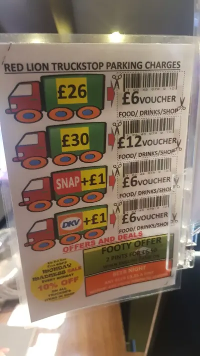 Favorite snap parking. Clean toilets and Showers in the restaurant. One token includes in price for parking, when you want one more token for shower you pay 1p. Food is not delicious, average, but not expensive. One big portions cost average 7,45p.(fish, chips, salat/beans, mayo),but beer is amazing
