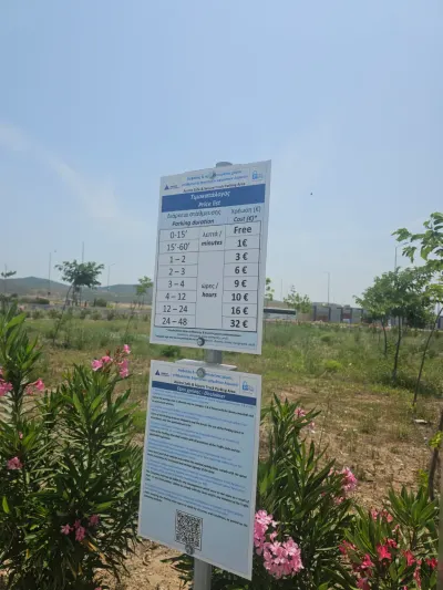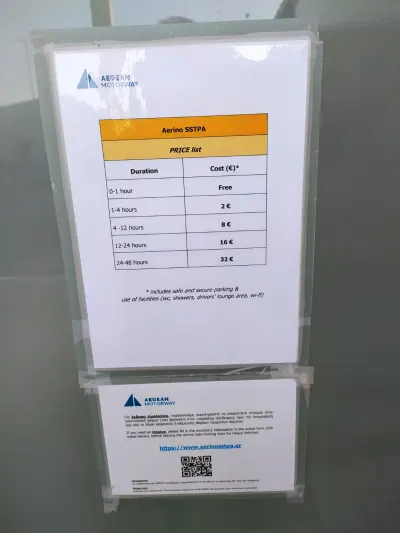 Parcare securizata cu garduri bariere și iluminat. Plata: 24H- 16Euro, 48H-32Euro, prima ora gratis. Dușuri și wc fără plata. Locuri de parcare în jur se 30. Spatii cu mese, aparat cafea și sucuri.