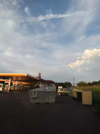 Хороший паркинг на 50 мест.15 евро из них 10 на еду. На выходных свободных мест много. Стоял 45-ку. На кассе заправки русскоговорящая девушка.