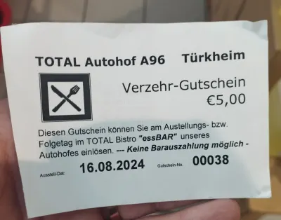 Отличный автохоф за 10 евро,есть стиральная машина и сушка по 3.50 евро,душ 4 евро,туалет 0,70 центов,можно набрать воды и есть банкомат Sparkasse, бургер Кинг,магазины 5 км,и Lidl 2 км.