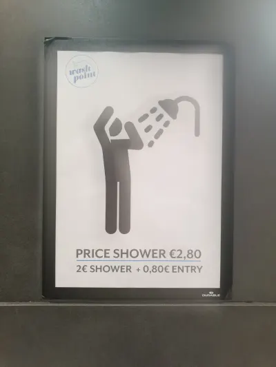 душ 2 чистый оплата у продавца сигарет и оставляем ключ от авто , но чтоб попасть в душ надо доплатить в аппарат на входе ещё 80 центов ( я перелез через турникет) воду нашел не сразу.